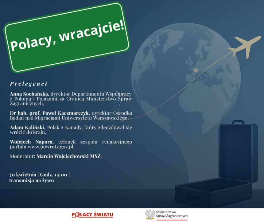 Serdecznie zapraszamy do udziału w internetowej dyskusji panelowej organizowanej przez MSZ pt. „Polacy, wracajcie” . Wydarzenie odbędzie się w środę, 30 kwietnia o godz. 14:00 czasu warszawskiego .